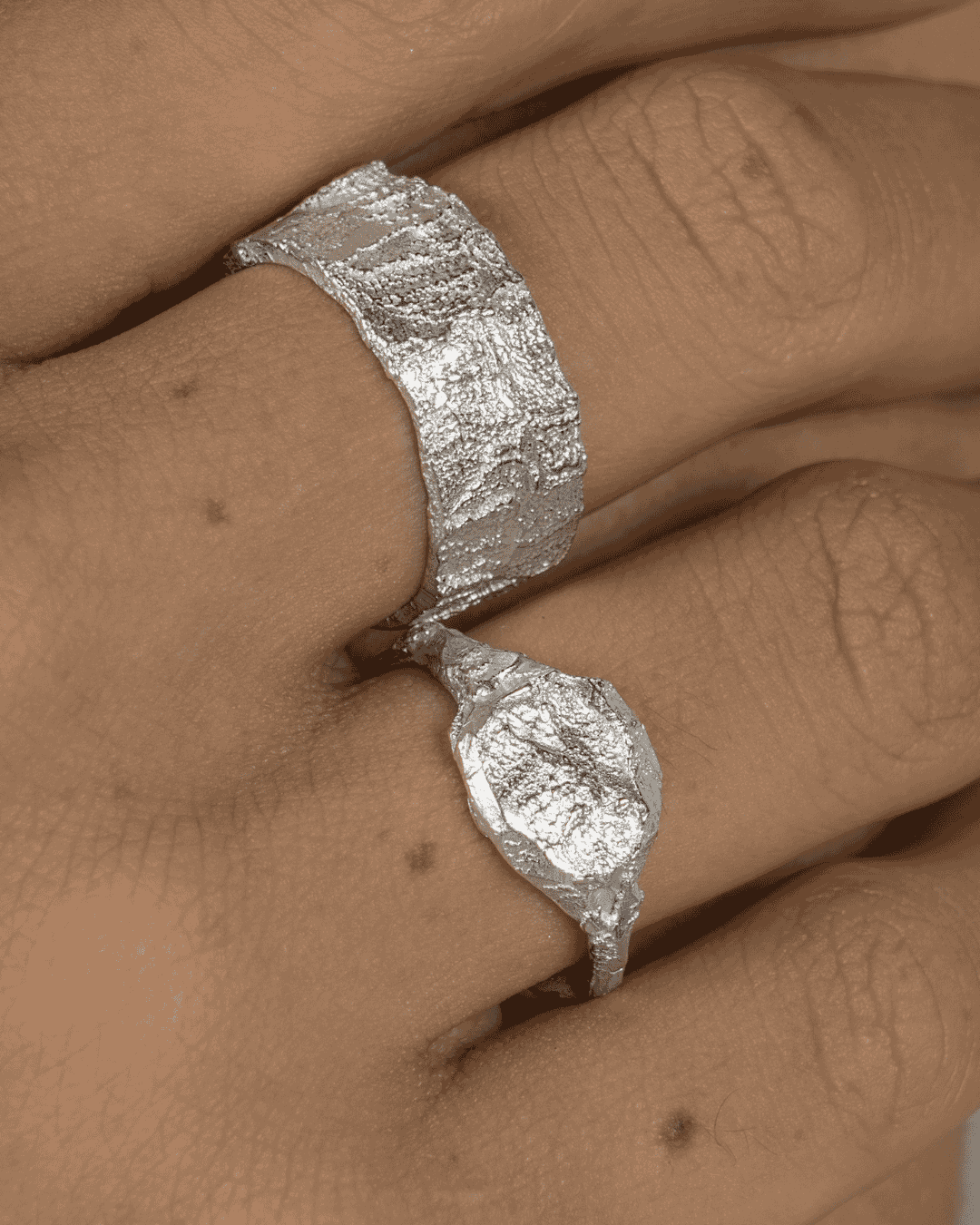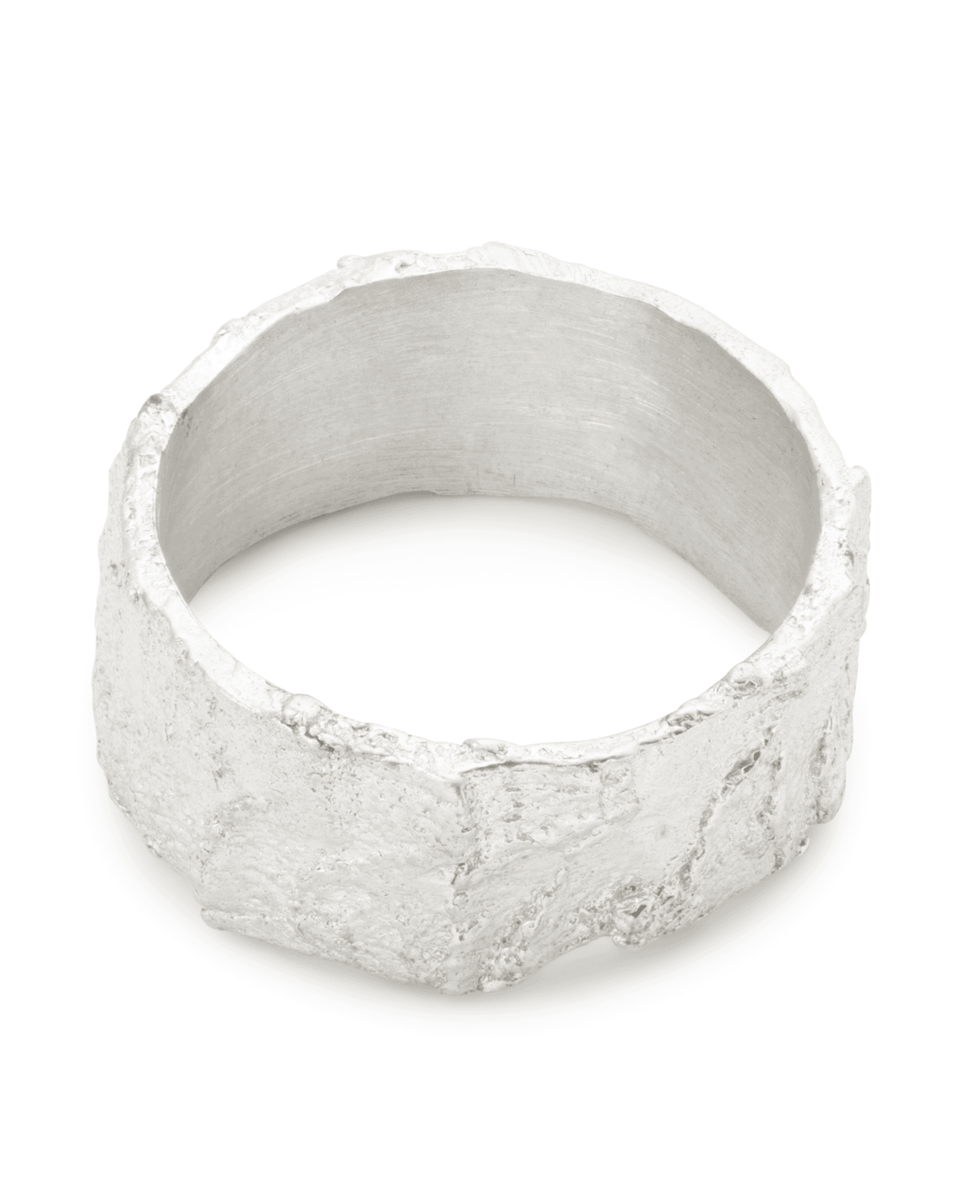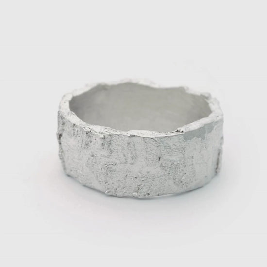 This wide band has irregular contours and asymmetrical textures that lend a contemporary edge to the classic cigar band, making this piece an everyday essential, can be worn as its own statement piece or paired with our Waasa band to make a bolder aesthetic.