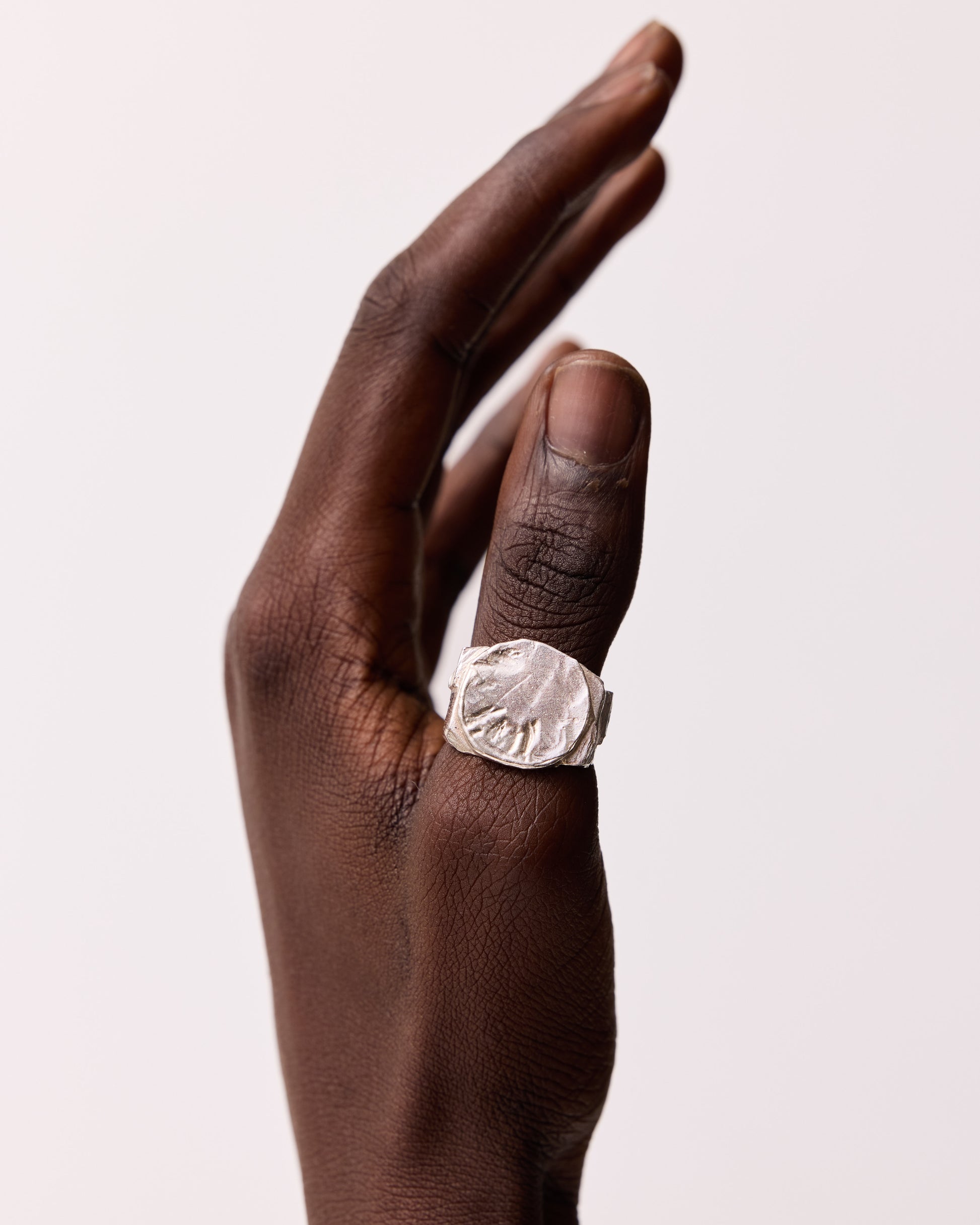 Heavy set signet styled ring with a polished texture face and layered angulated edges connected by a wide two toned textured band.