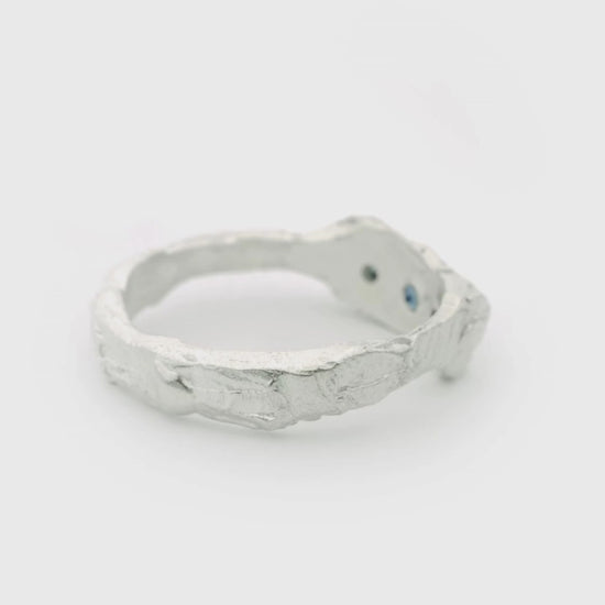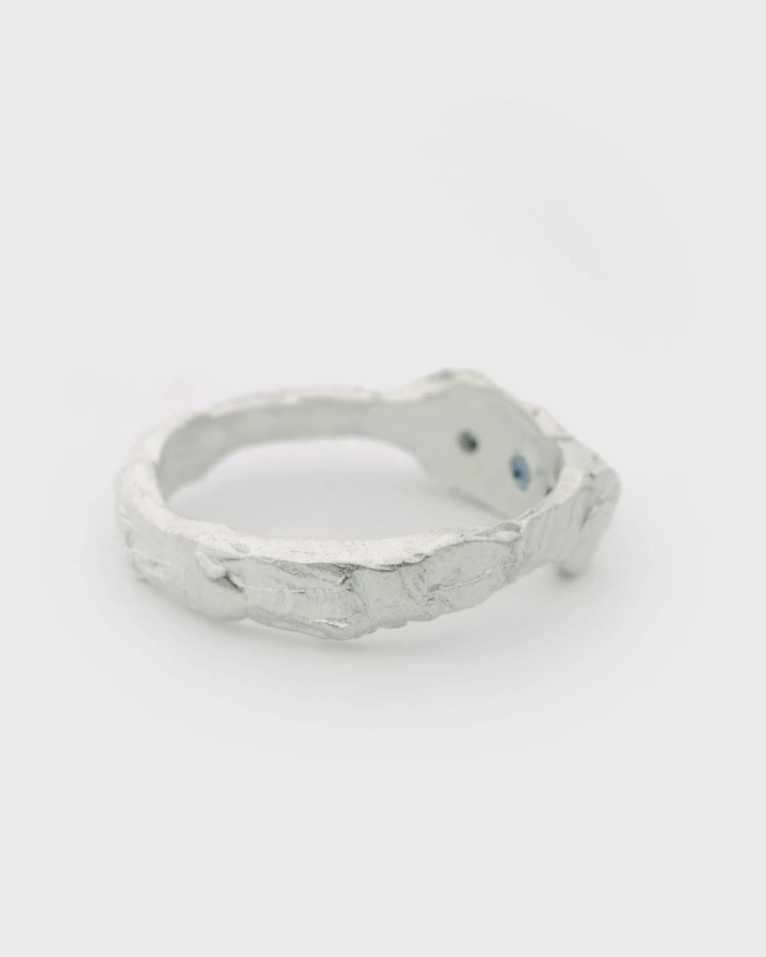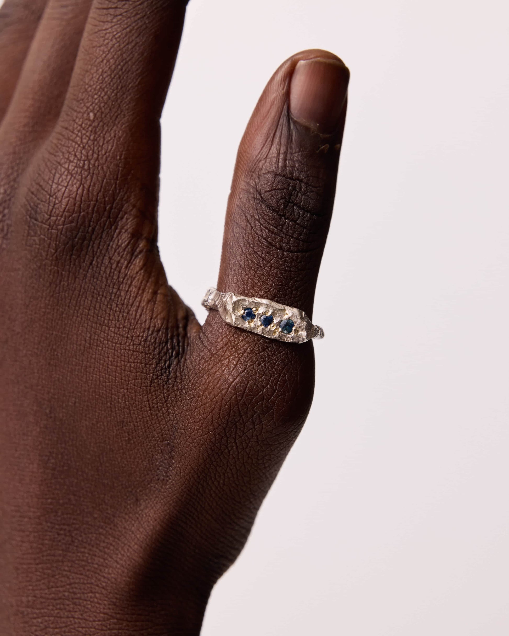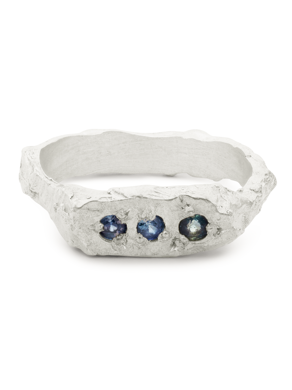 Sparkly twist on our signature Feliu ring, an uneven rectangle shaped signet ring with a decaying textured face and an equally distressed and textured band. Centered with 3 blue sapphires.