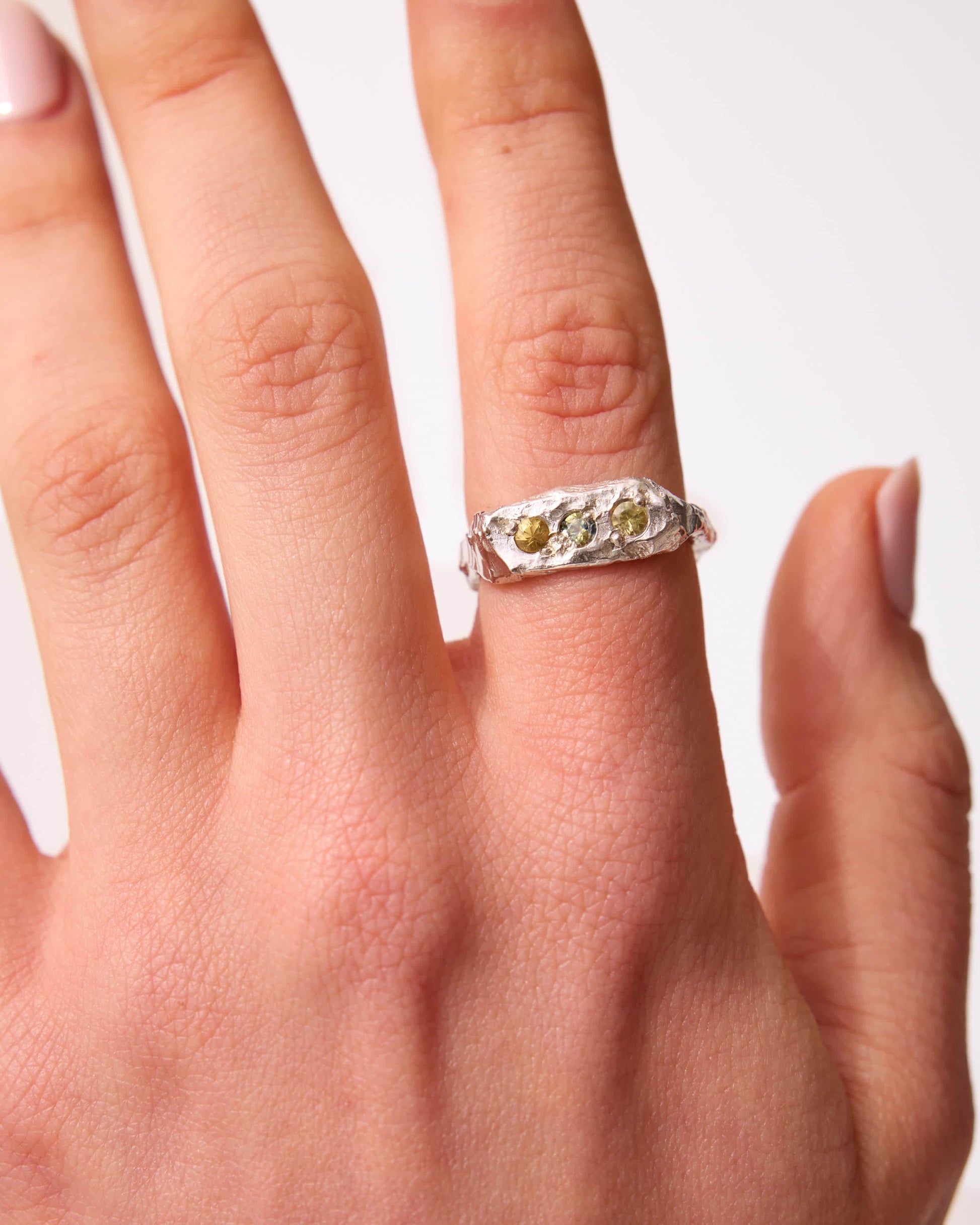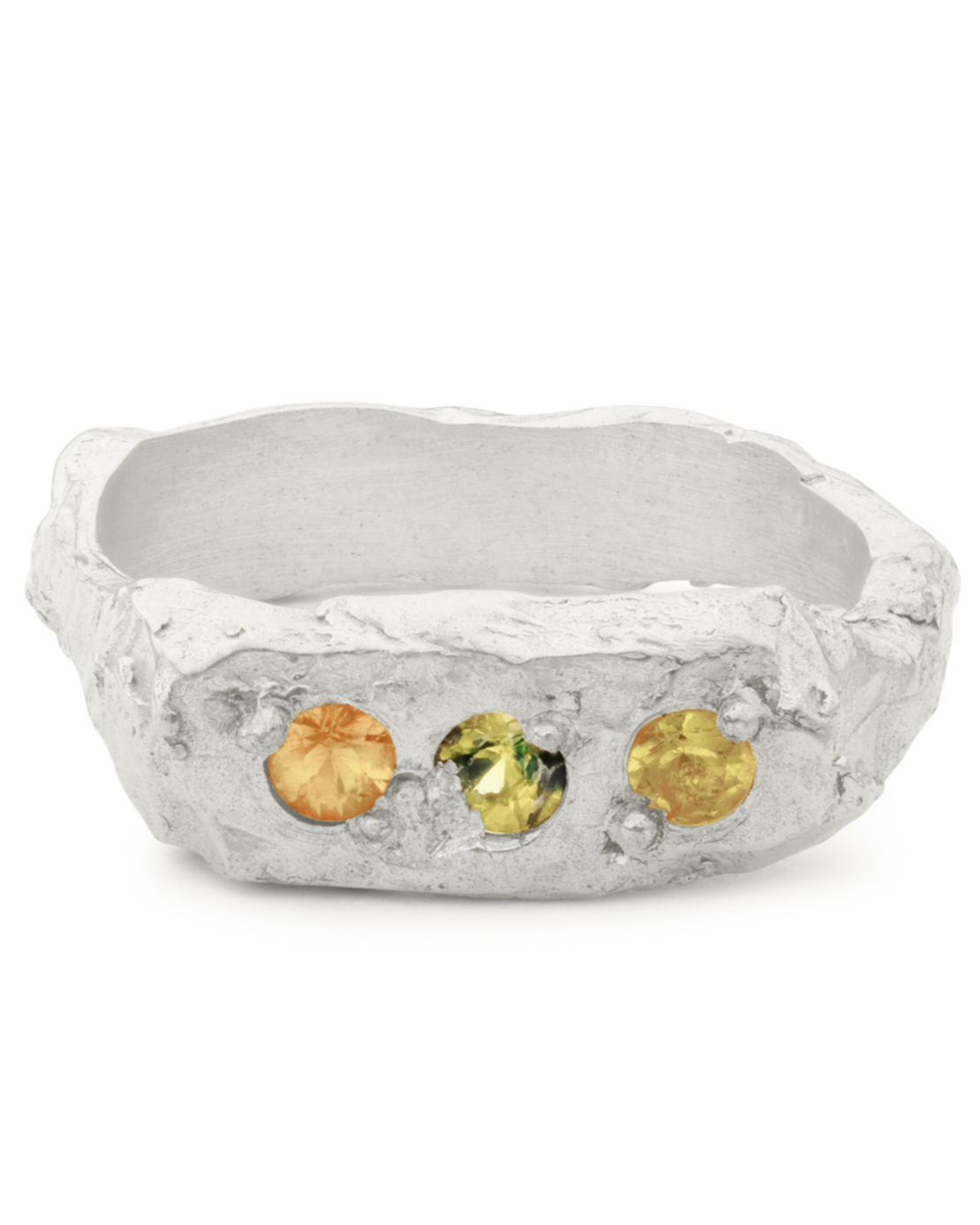 Sparkly twist on our signature Feliu ring, an uneven rectangle shaped signet styled ring with a decaying textured yet smoothly polished face centered with 3 yellow sapphires with an equally distressed and textured band.