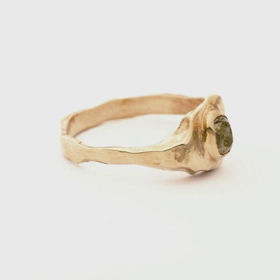 Slightly skewed rectangle based signet with softly polished edges and a thin mildly textured band, centred with a round coloured diamond.