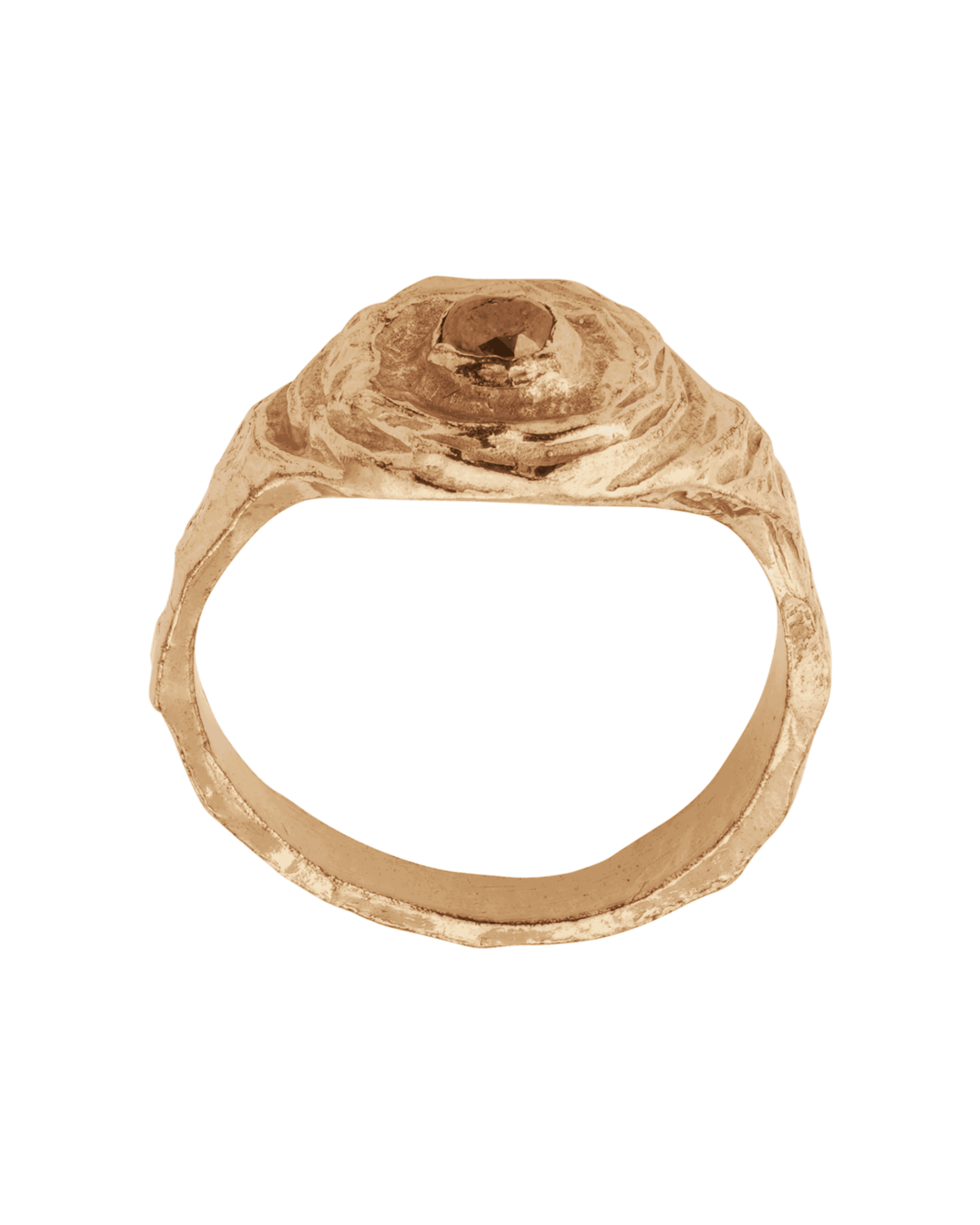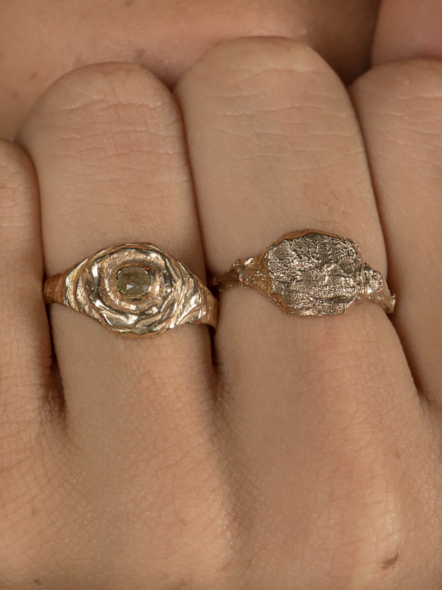 Layered with petal like, buffed edges, this highly polished signet is centred with a natural coloured diamond, connected with a slightly distressed, asymmetrical band.