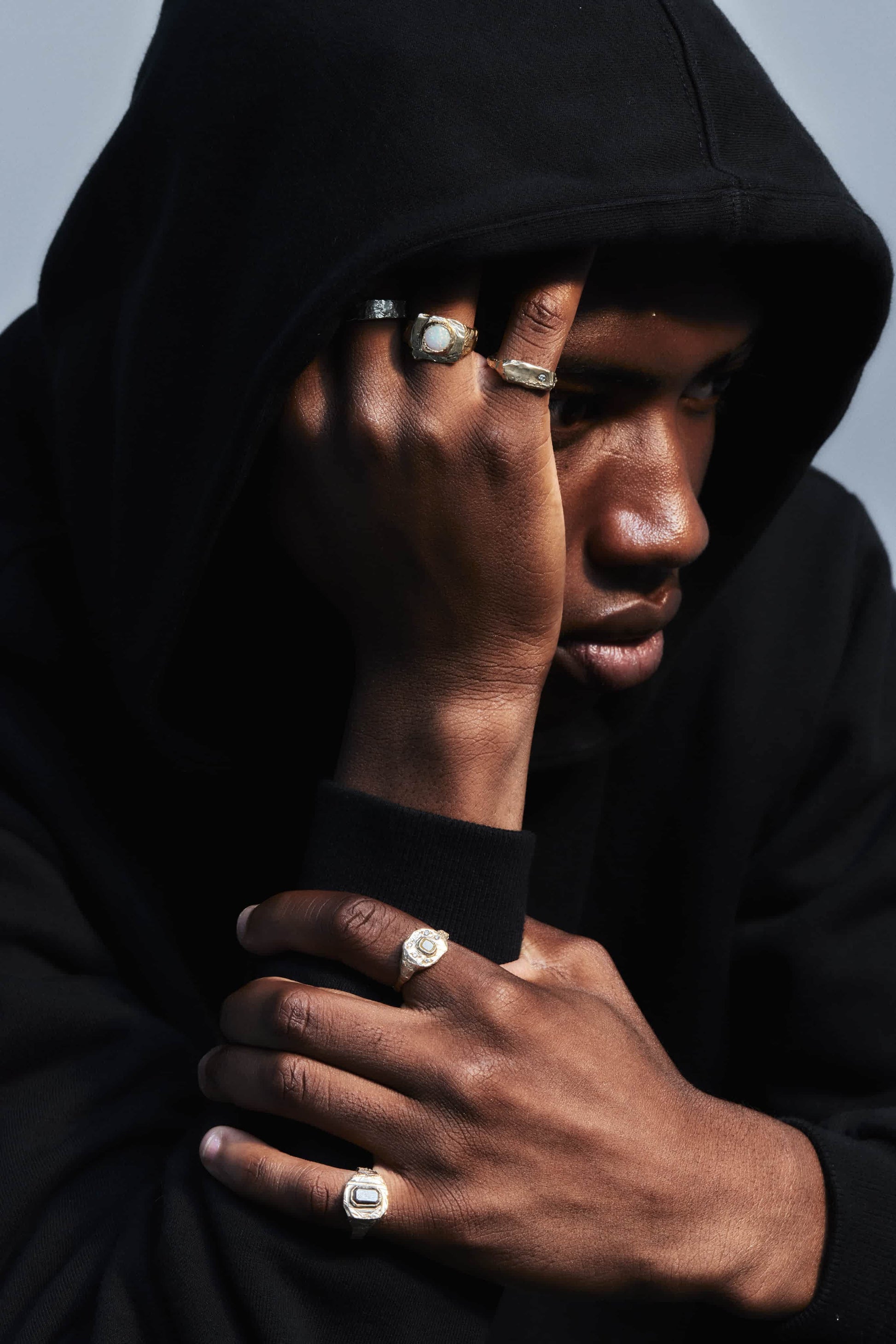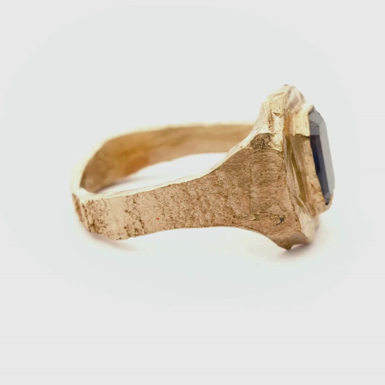 Grainy and gritty textured band leading into an asymmetrically square shaped signet with etched like detailing surrounding a large brown diamond.