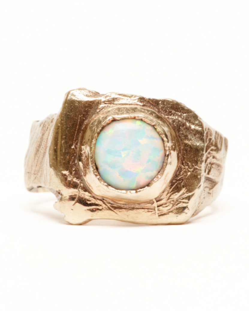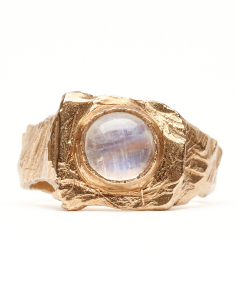 The first piece we ever sent to production. Statement ring that brings elegance to a bold design, featuring a square styled, textured face, centred with an 8mm cabochon stone of choice cradled in a bezel setting, accompanied with an equally textured, heavy set band.