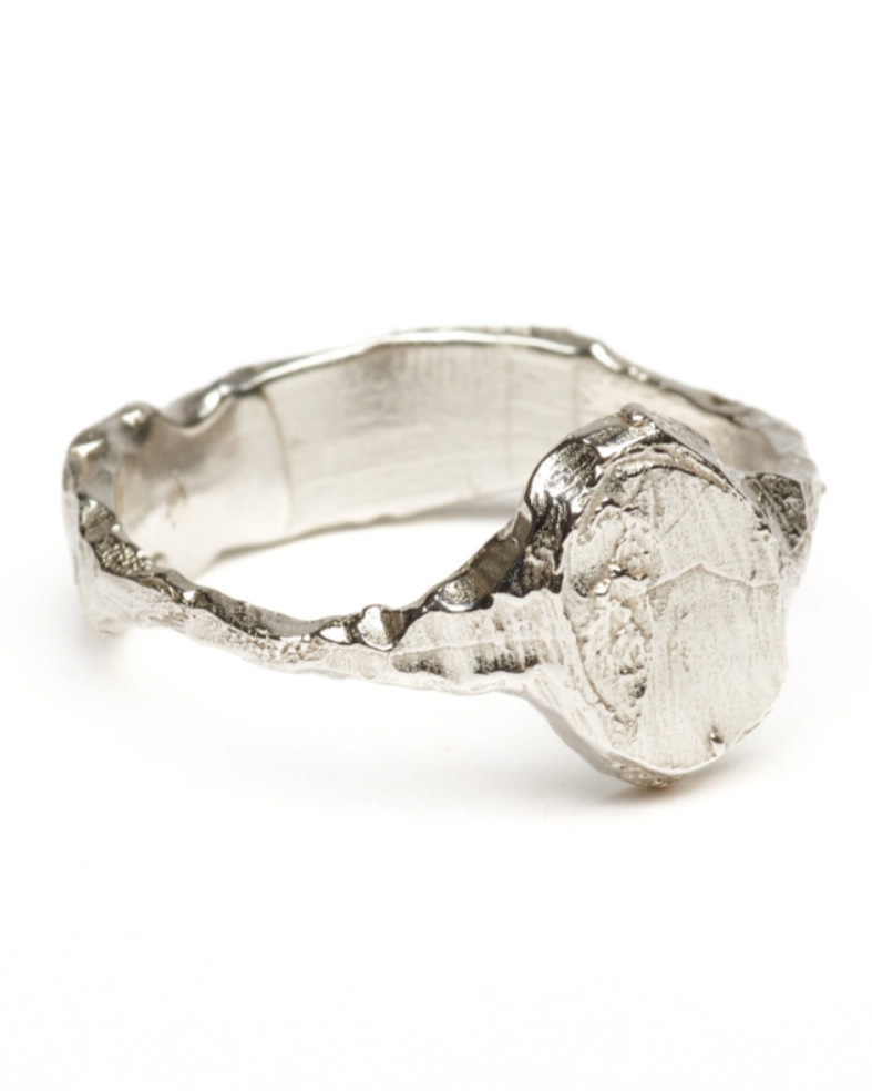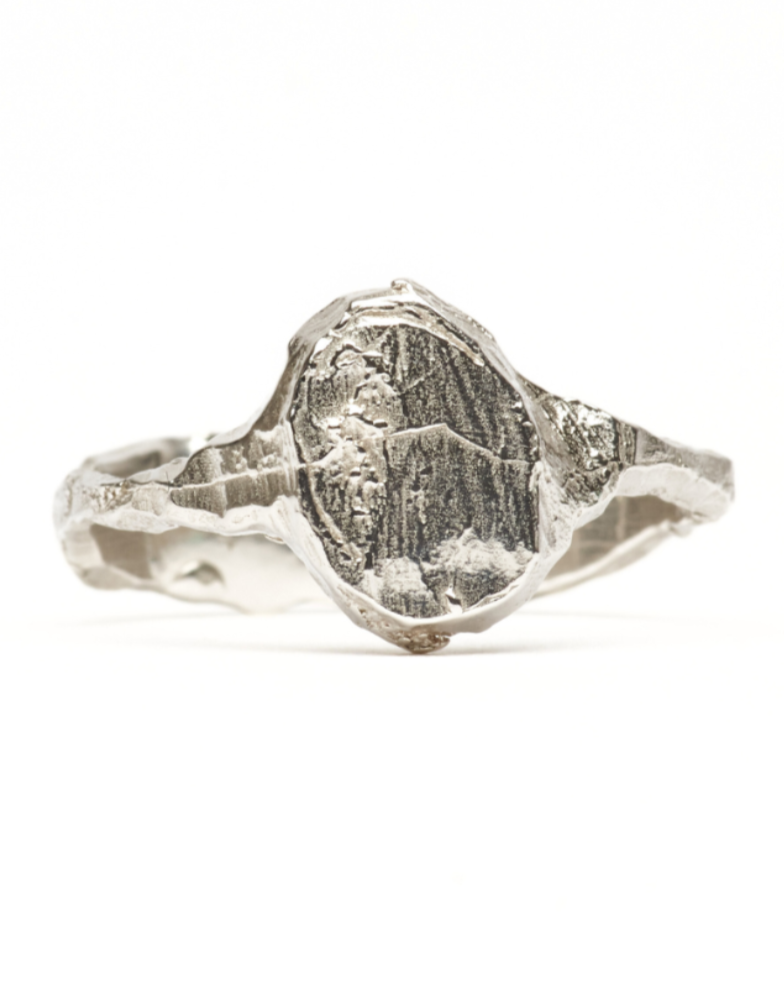 Delicate and dainty signet with a highly polished and slightly textured oval shaped face connected by a thin, asymmetrical sculptured band.