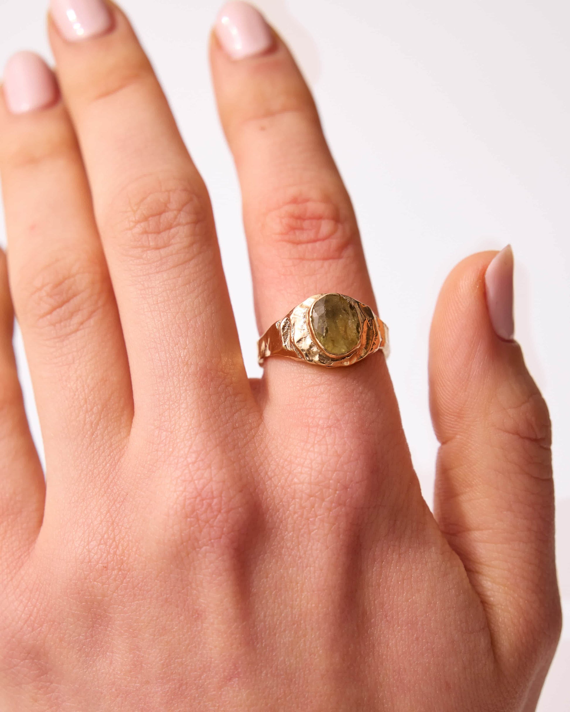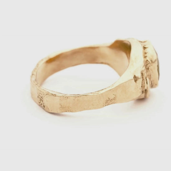 Chunky styled signet with a soft edged and organically textured band rising into a slightly more distressed face leading to a large yellow sapphire enclosed at the top.
