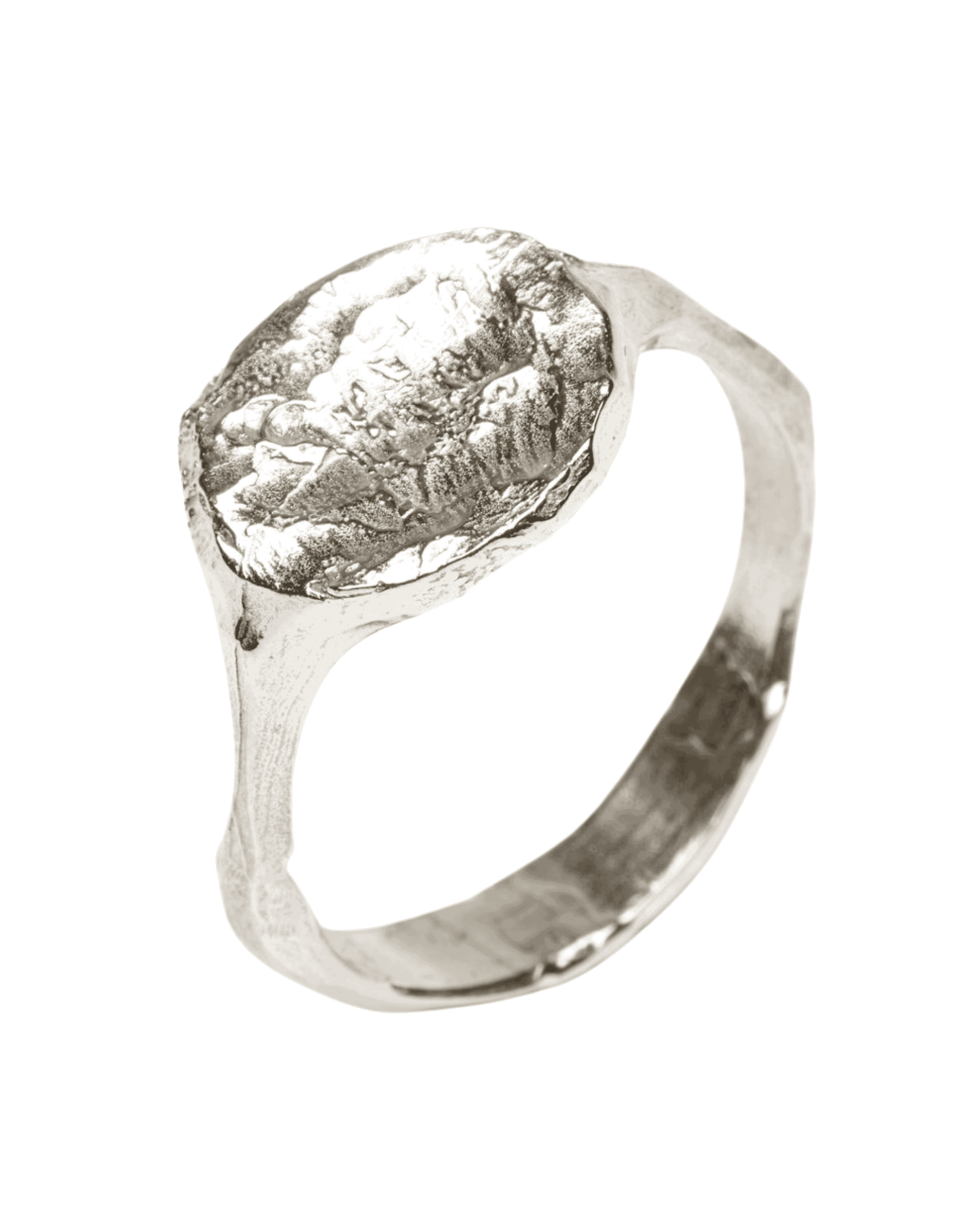 Signet styled ring with a spherical, decayed face accompanied by a thin, multi edged, asymmetrical band.