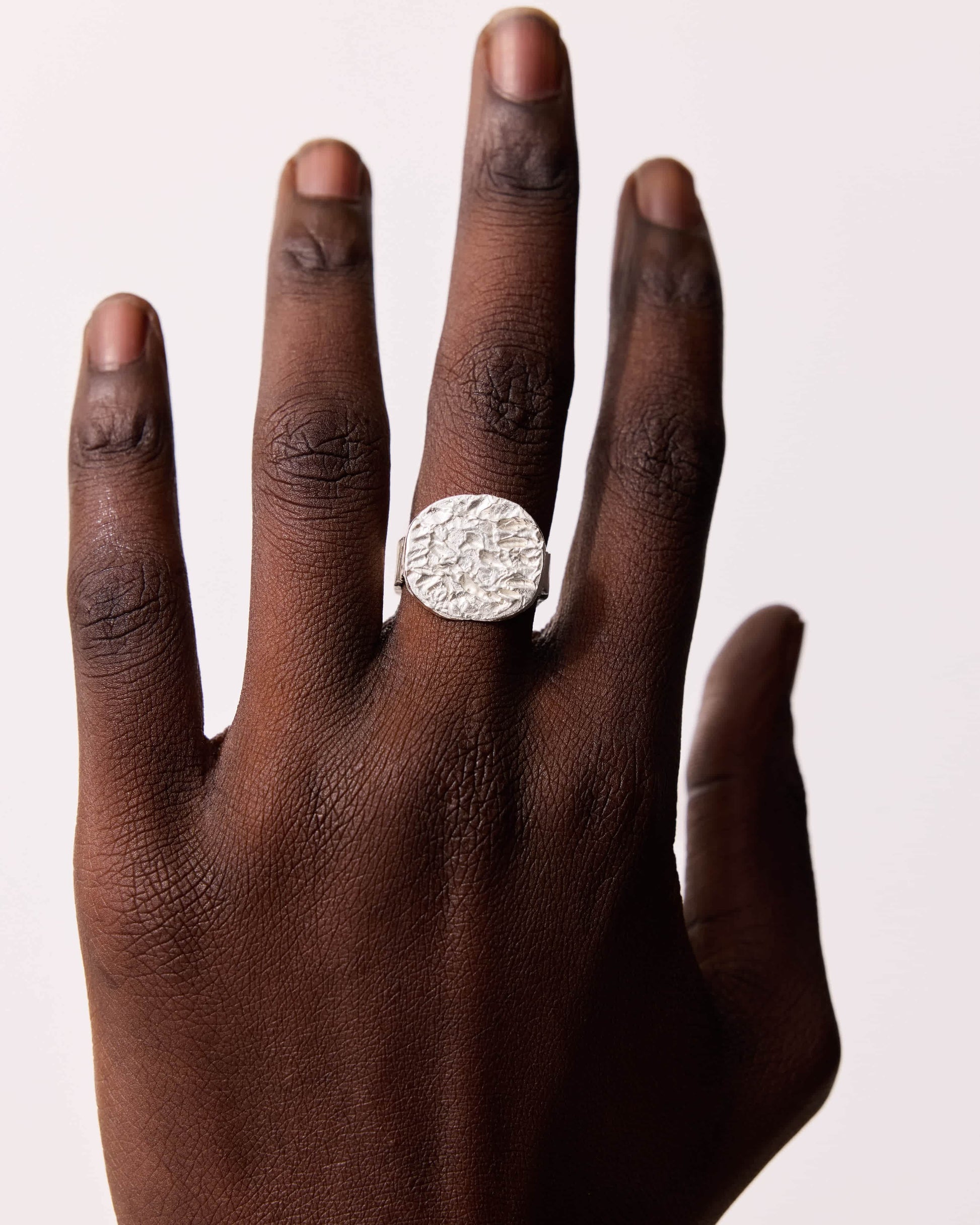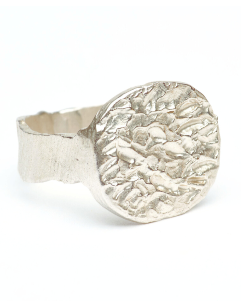 Large signet styled ring with a heavily grooved and indented face connected by a serrated textured band.